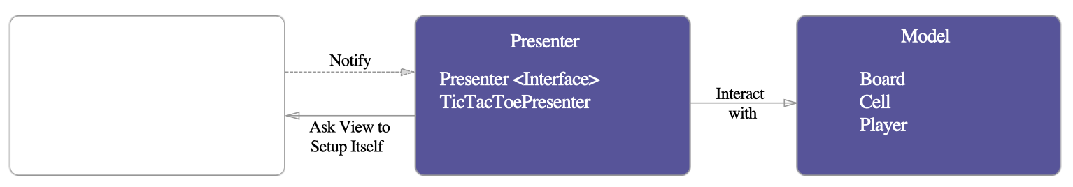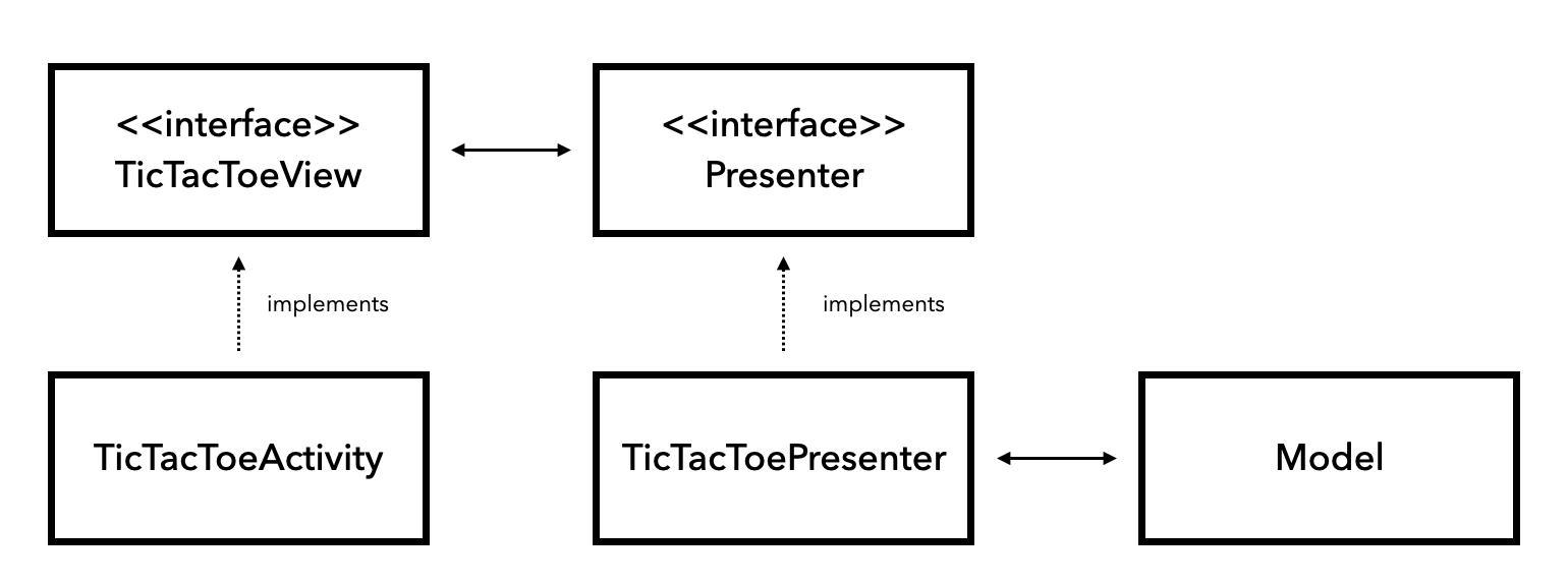 단점 : View와 Presenter가 1:1관계를 가지는 문제가 있습니다. 이 때문에 앱이 복잡해질수록 View와 Presenter의 의존관계가 강해지고, View가 많아지면 그에 따라 Presenter도 많아집니다. 특히 이 TicTacToe를 보여주는 다른 View가 새로 생기게 된다면 이를 위해 중복의 Presenter가 생기고, 코드 중복이 발생할 수 밖에 없습니다.